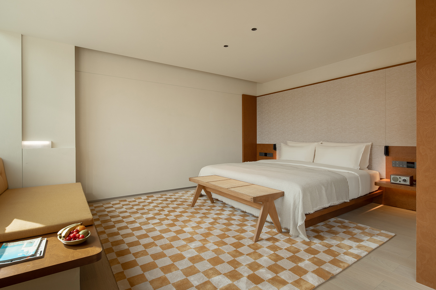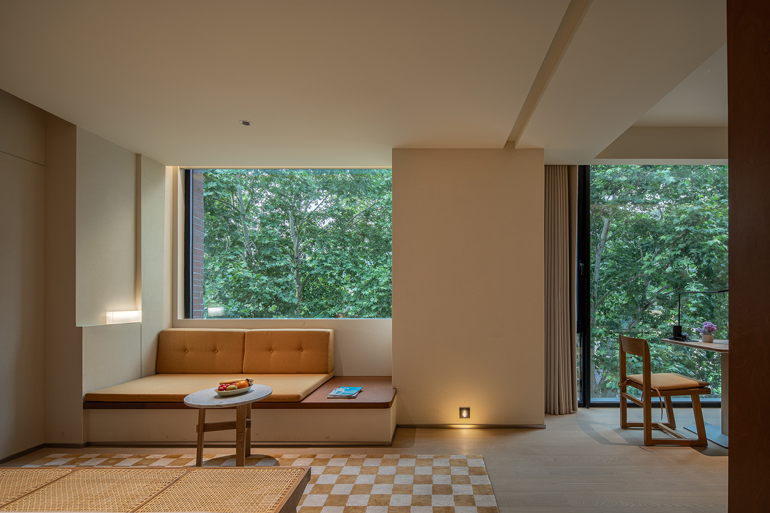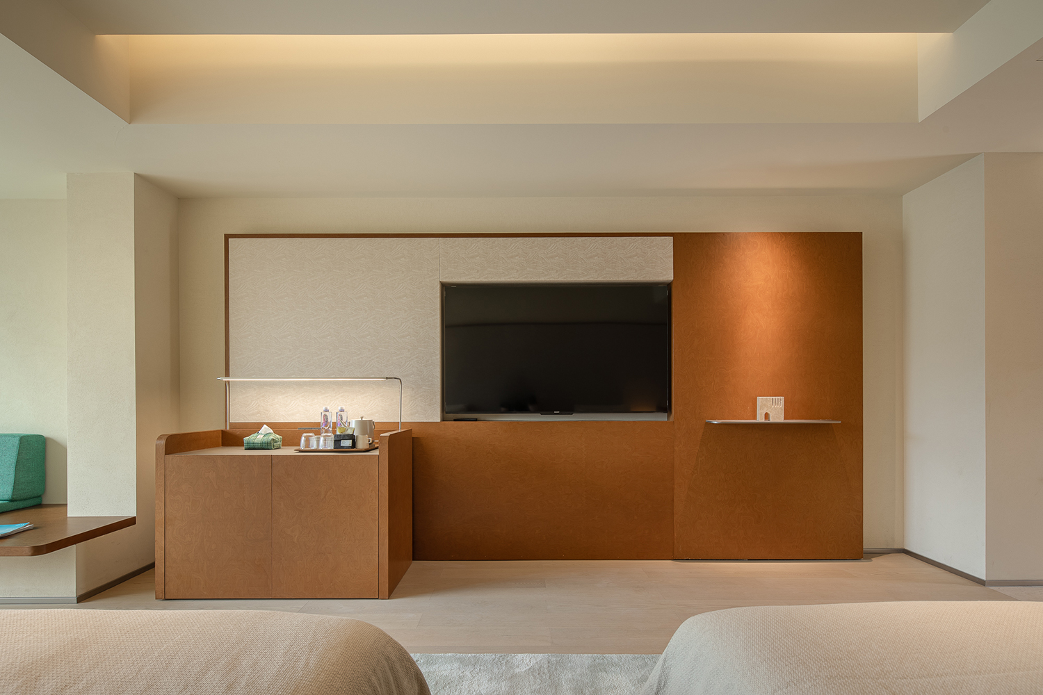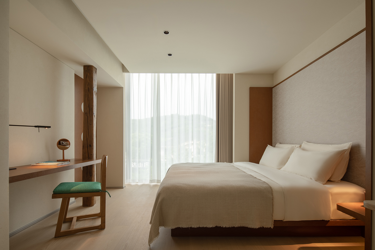 客房采用了较为柔和温暖的色彩基底,自然与现代材料并行。以跳跃的颜色点缀,克制而简洁的设计语言引入年轻、当代的味道,共同营造出具有新生命般活跃又宁静、低调又时尚的艺术秘境。