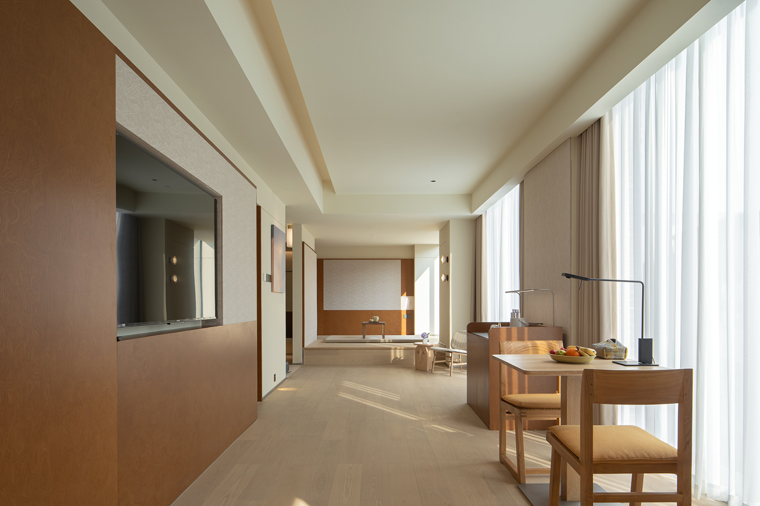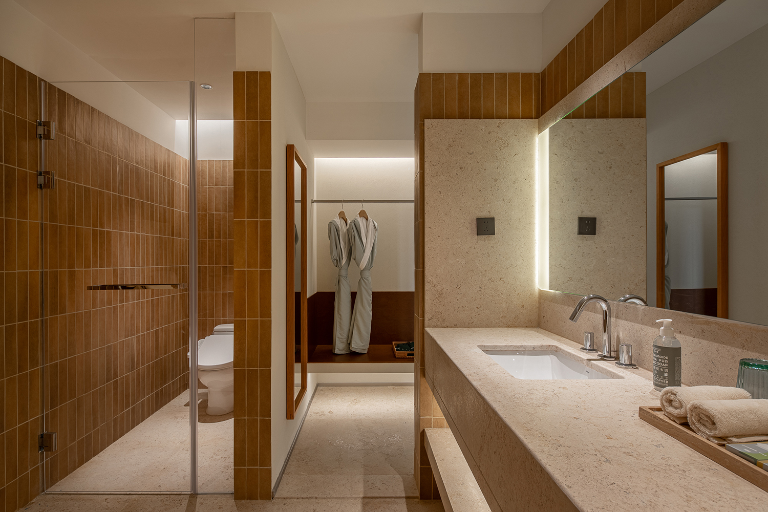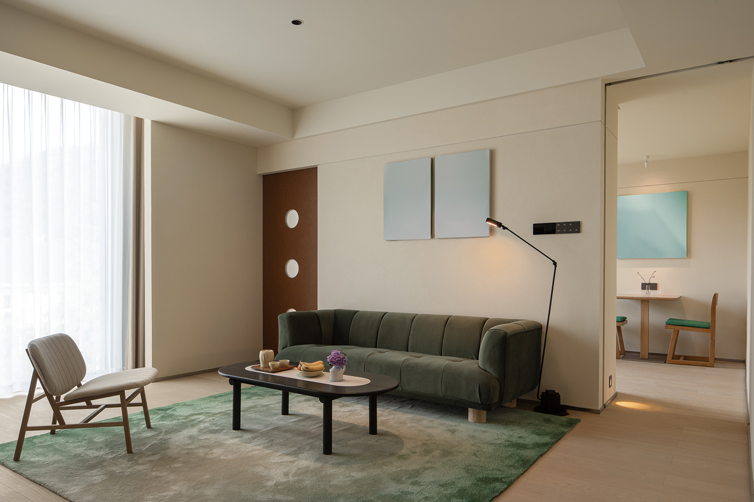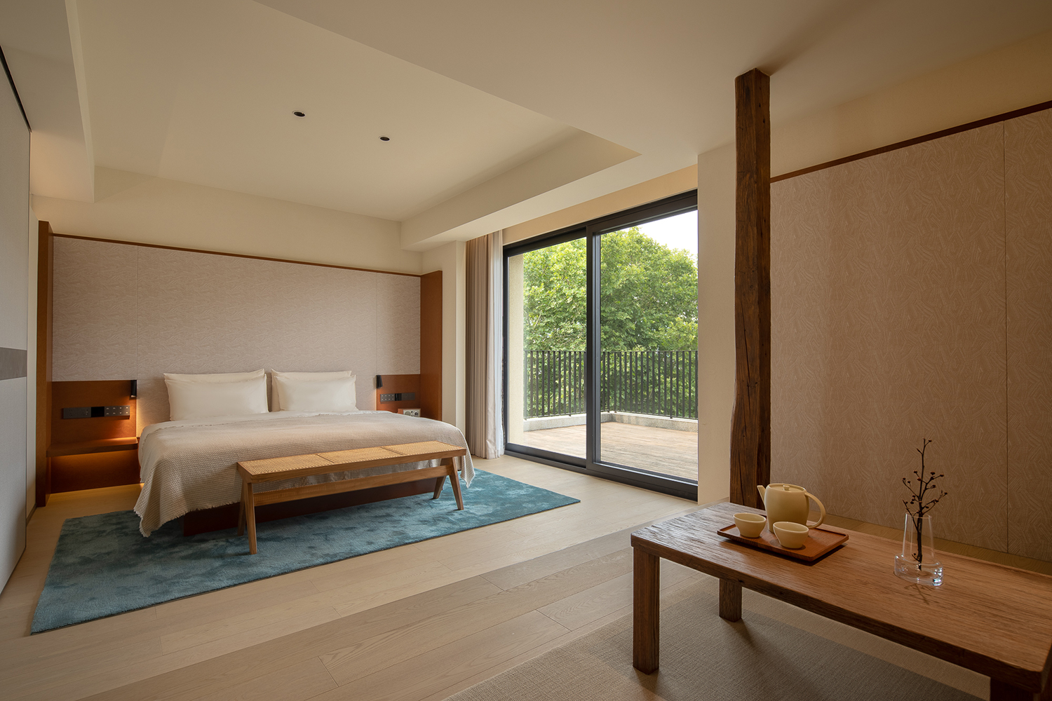 客房采用了较为柔和温暖的色彩基底,自然与现代材料并行。以跳跃的颜色点缀,克制而简洁的设计语言引入年轻、当代的味道,共同营造出具有新生命般活跃又宁静、低调又时尚的艺术秘境。