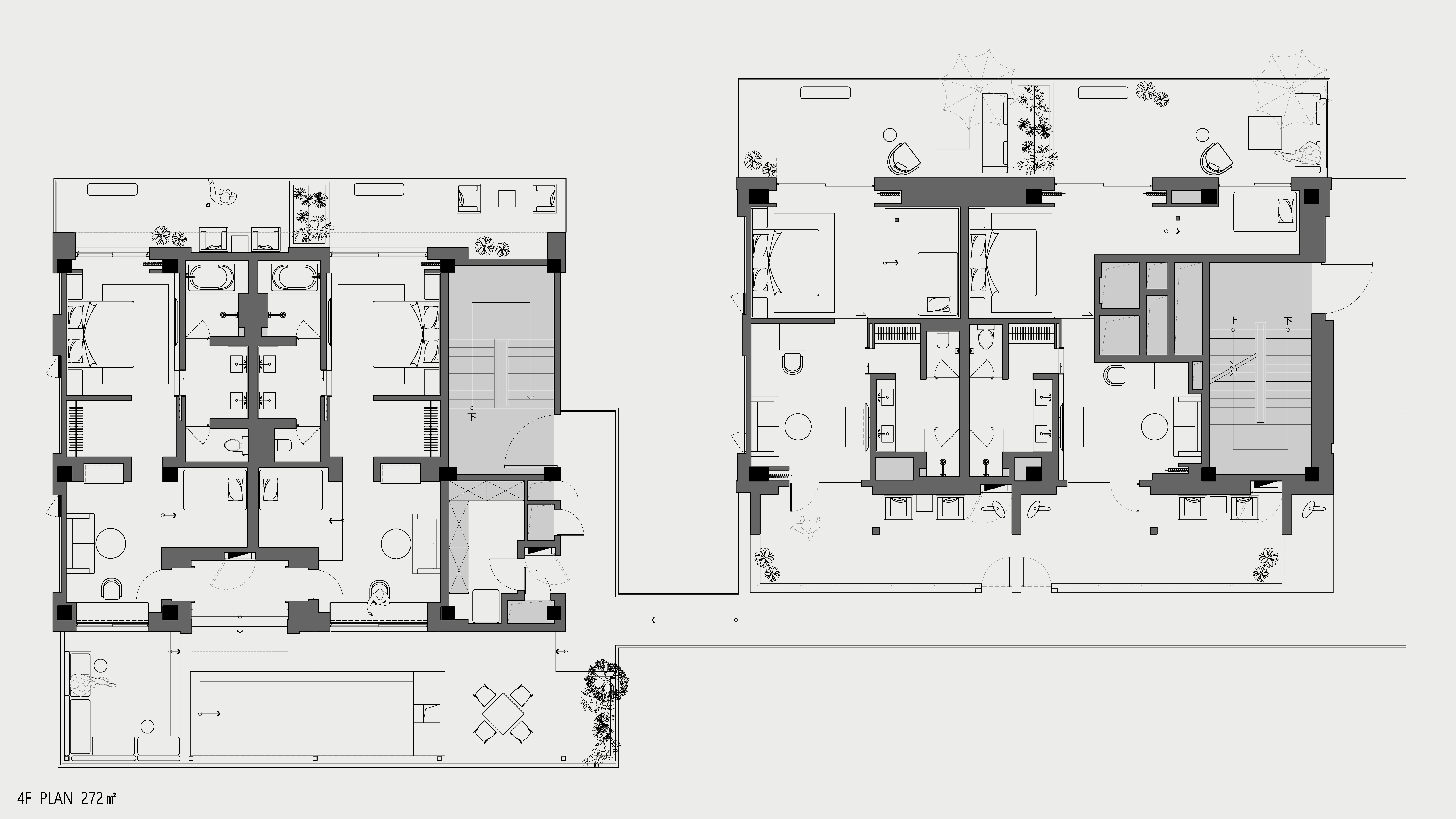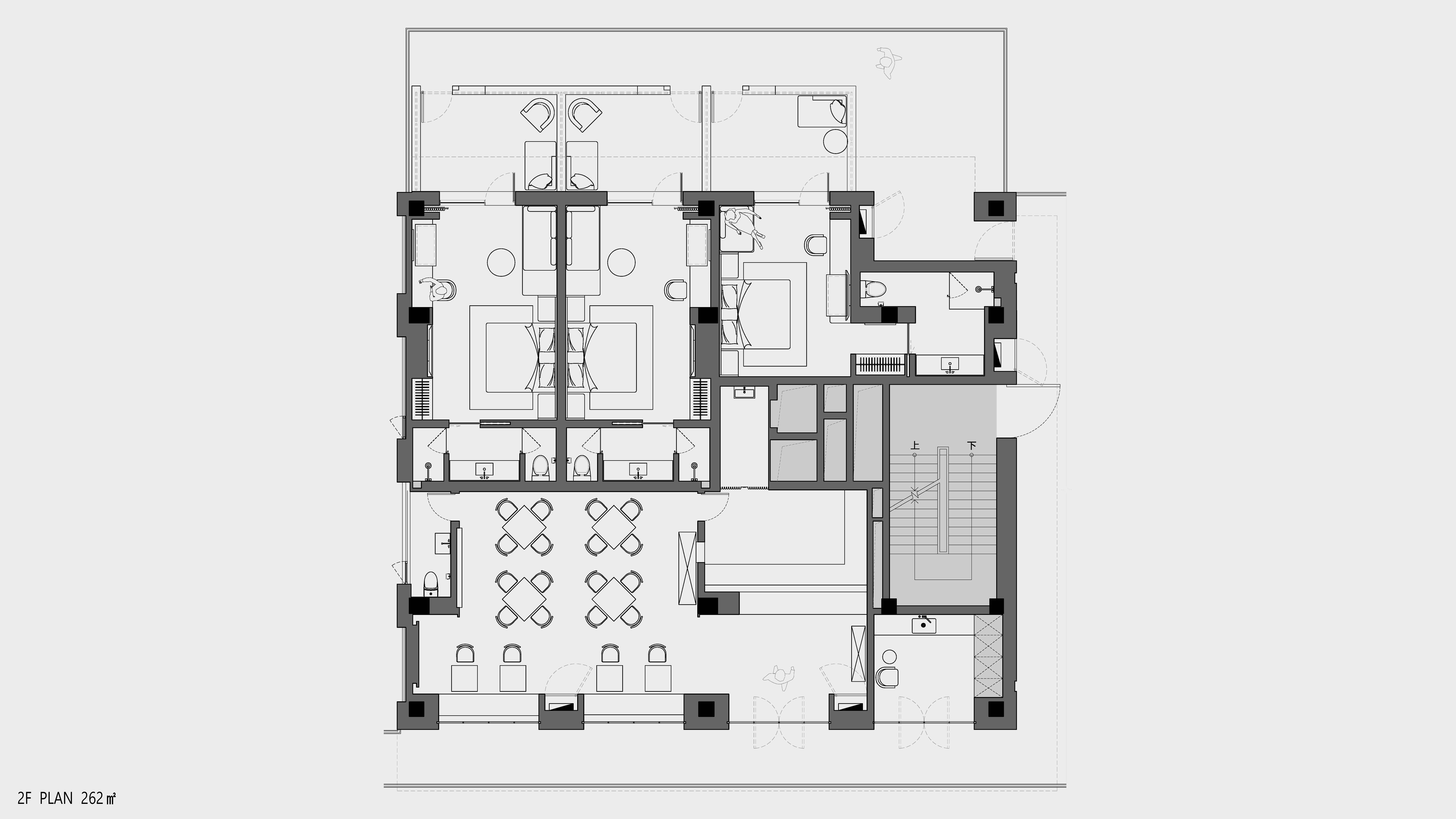 酒店由4层楼组成,共13间客房。其中1-2楼涵盖咖啡厅,餐厅,精酿吧,文创区,接待前台等区域;2-4楼涵盖客房和景观戏水池,包含大床房、双床房、套房等房型;其中3-4楼客房公区及露台区均有艺术品展览。