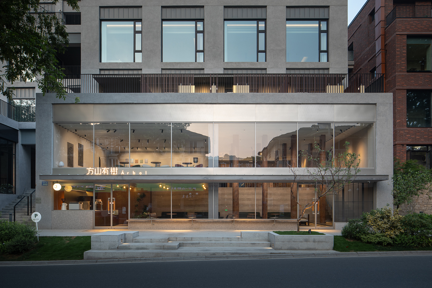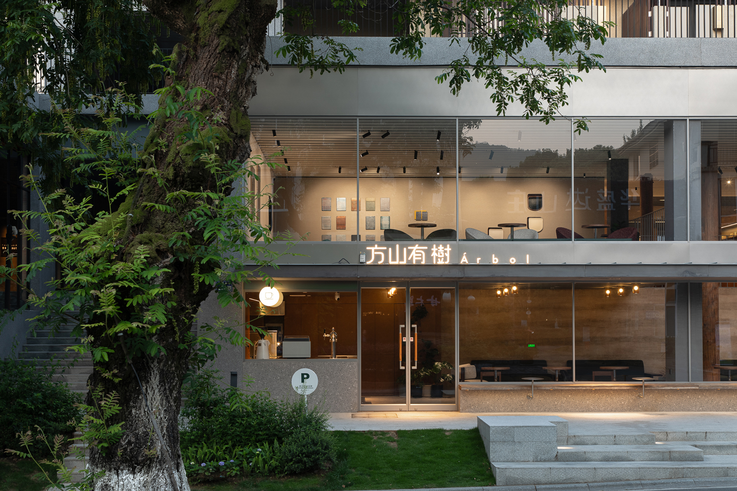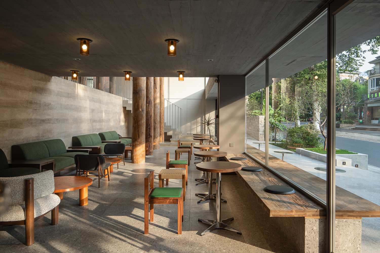 在设计中运用数根来自老建筑拆下的木柱形成水泥建筑中的小树林,附以其新的概念成长于此。